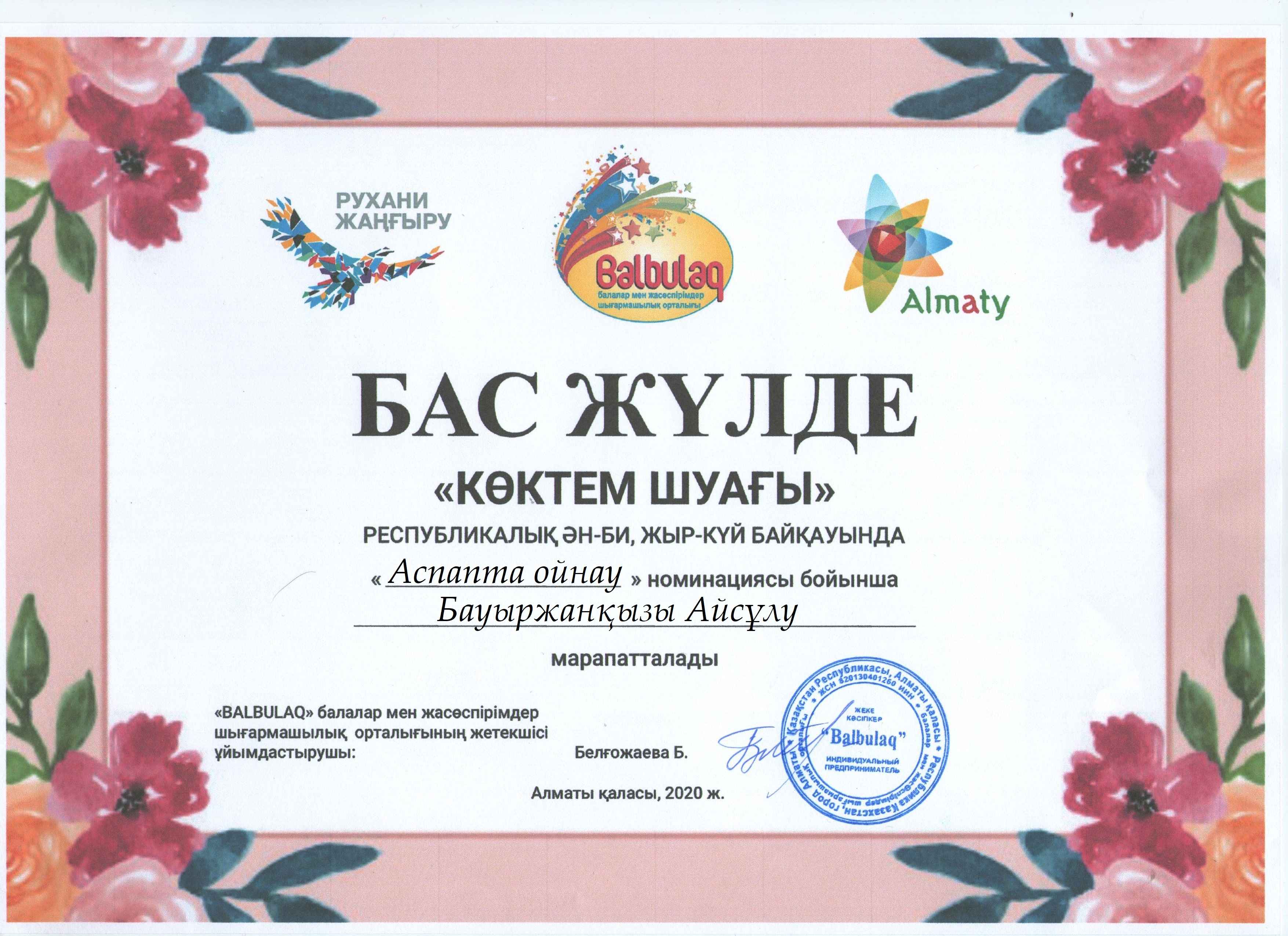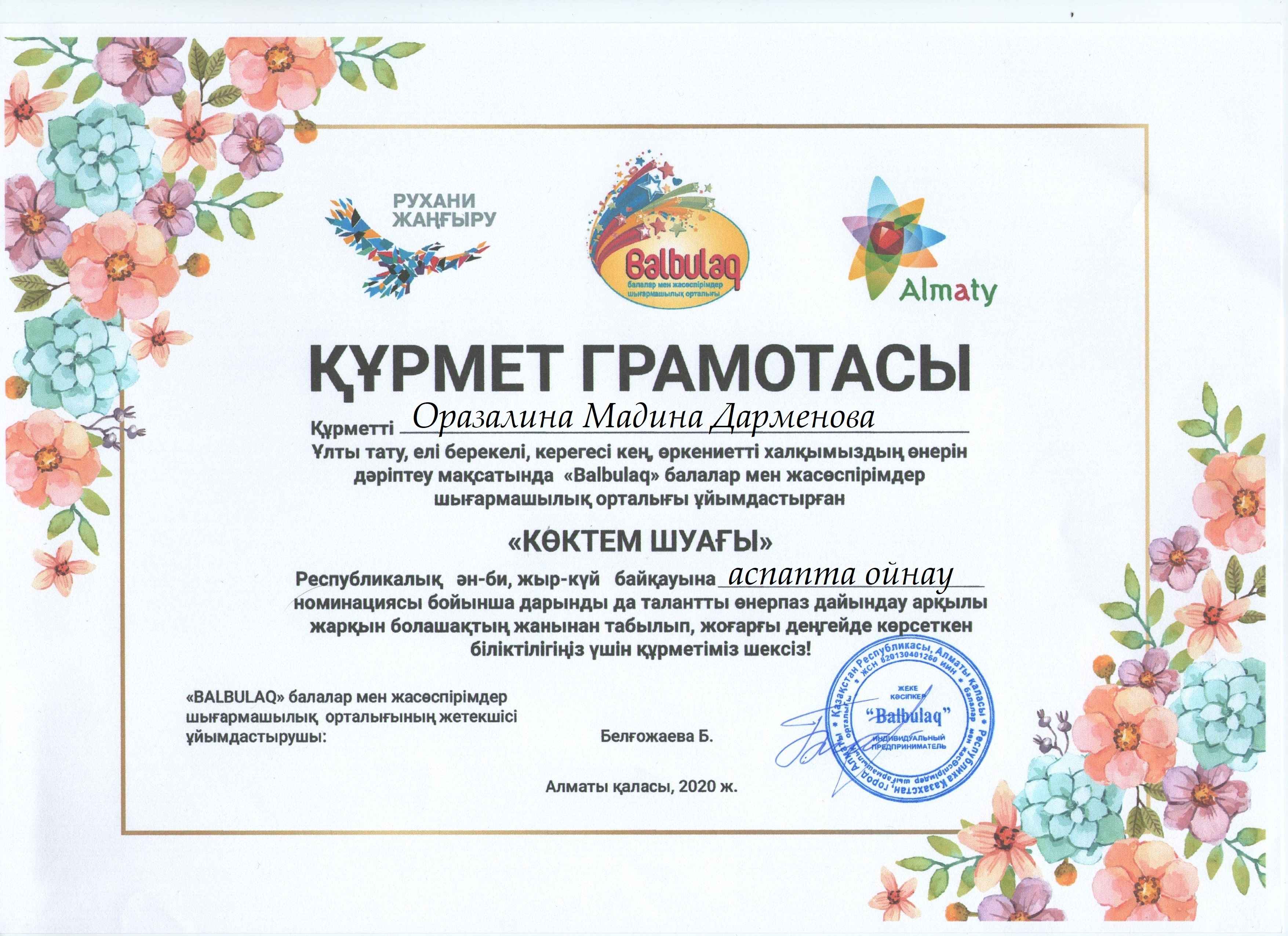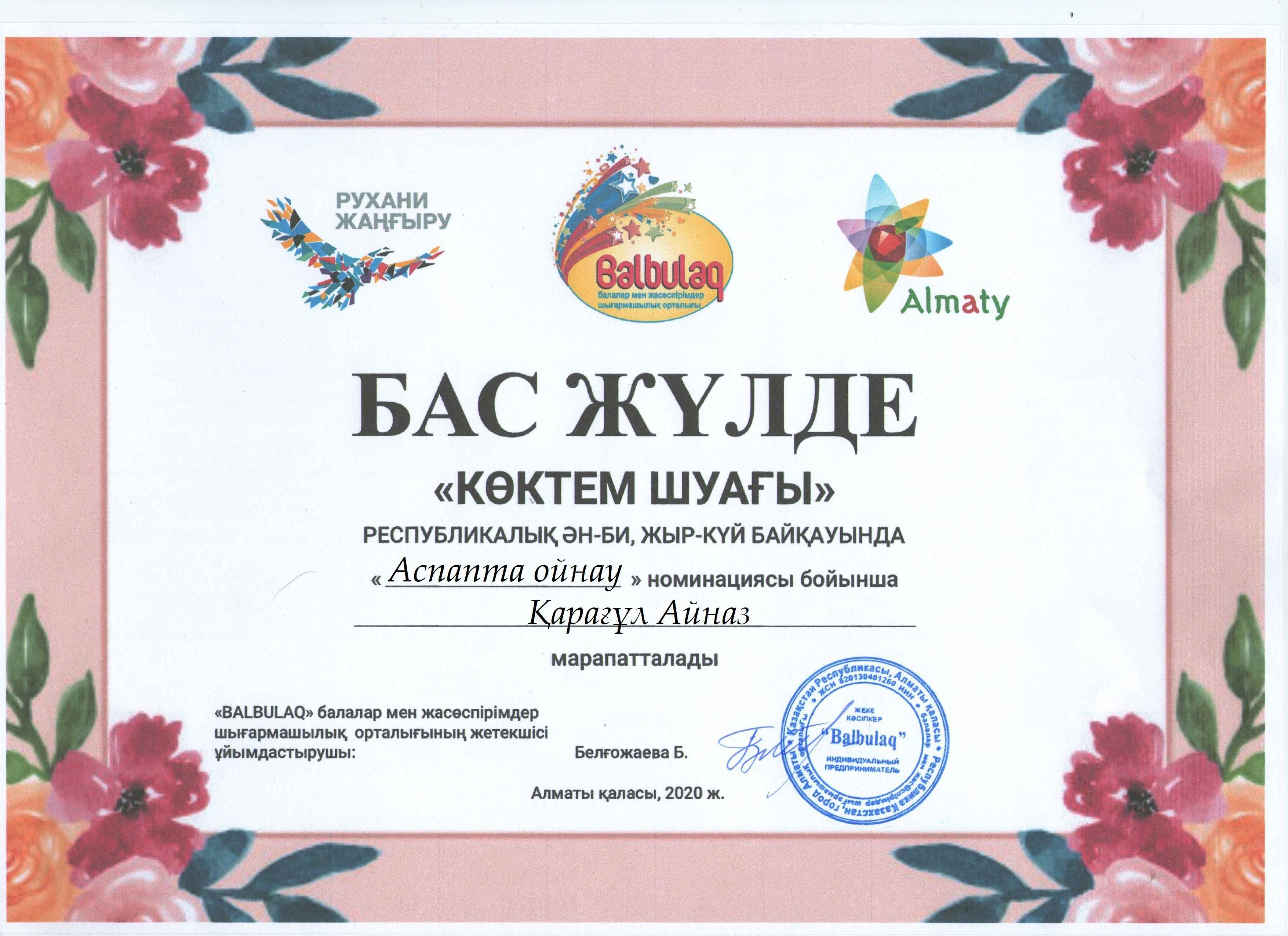 «Бал бұлақ» балалар мен жасөспірімдер шығармашылық орталығы ұйымдастырған «Көктем шуағы» республикалық ән-би, жыр -күй байқауына«Жангелдин ауданының білім беру бөлімінің Болат Хамзин атындағы өнер мектебі» КММ -нің оқушылары қатысып жүлделі орындарға ие болды. Осы жаналықты Б.Хамзин атындағы өнер метебі сайтына орналастырсаңыздар.