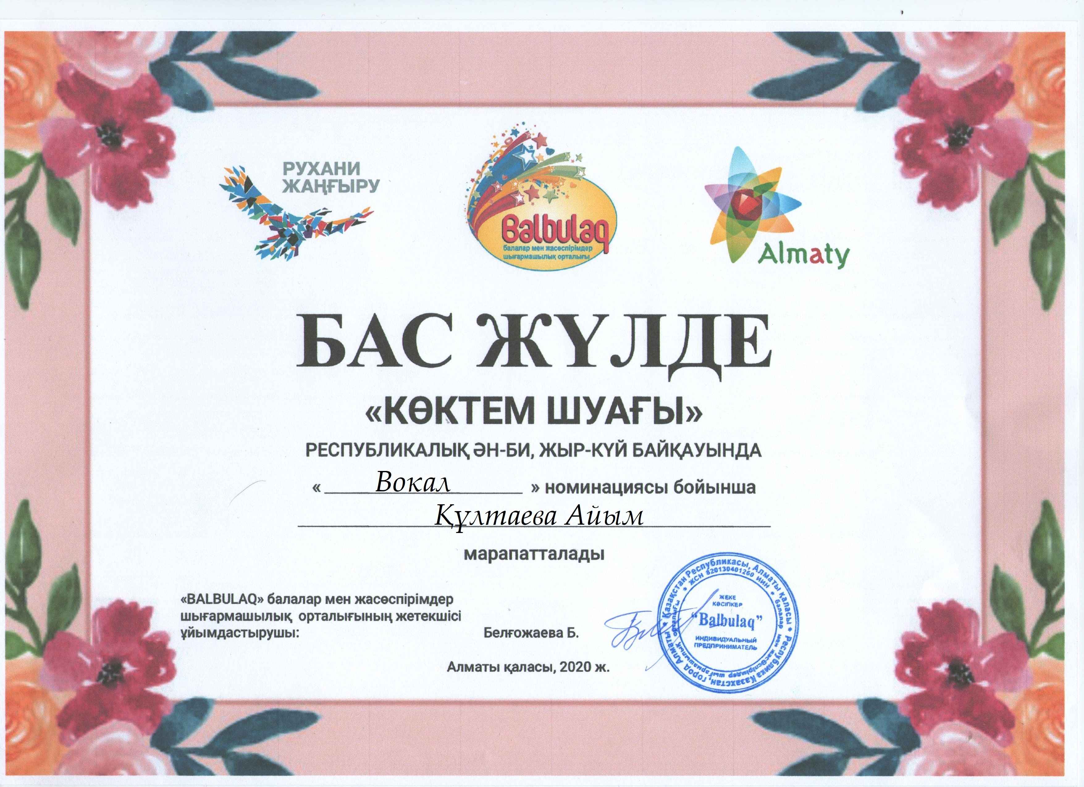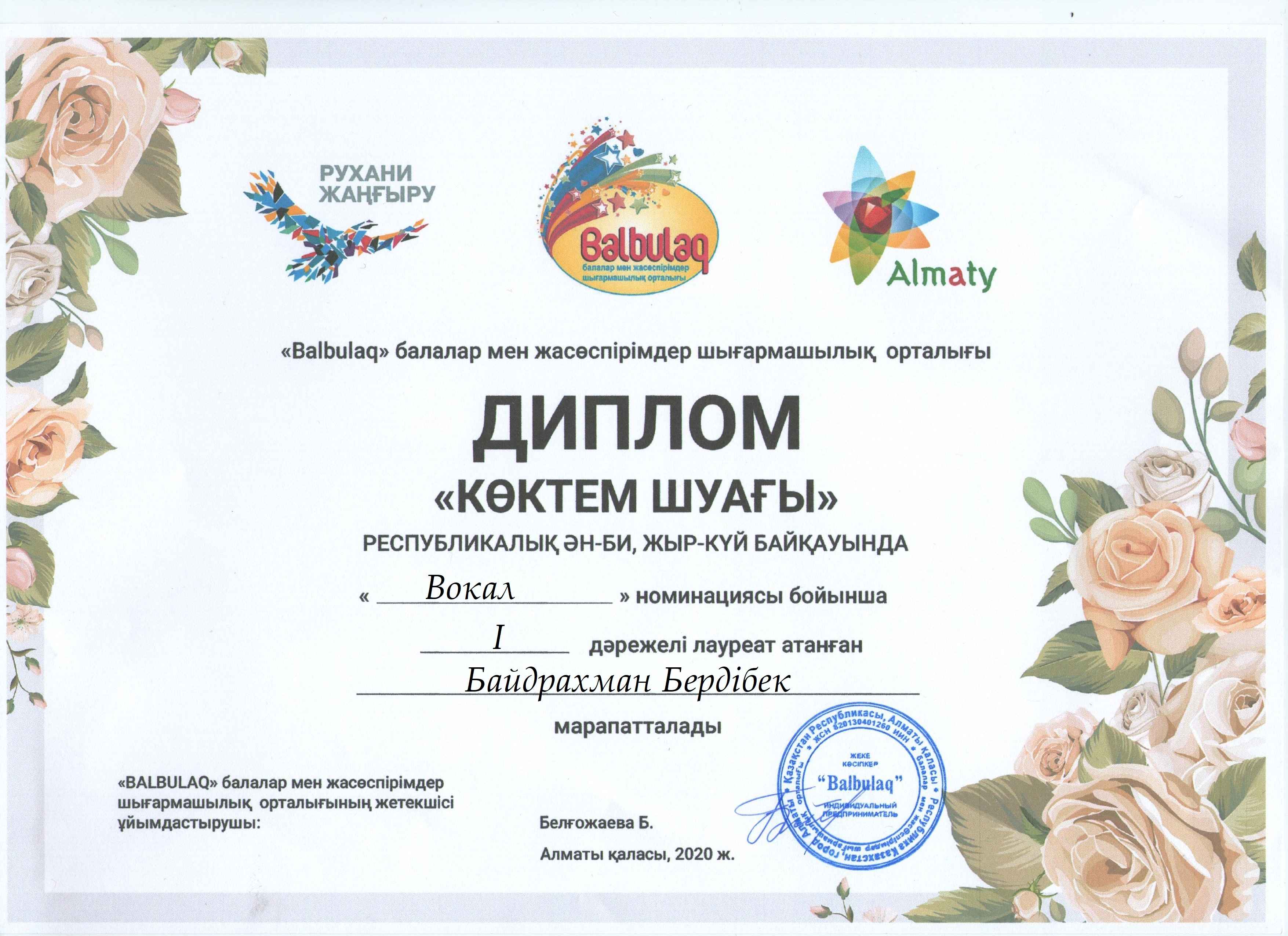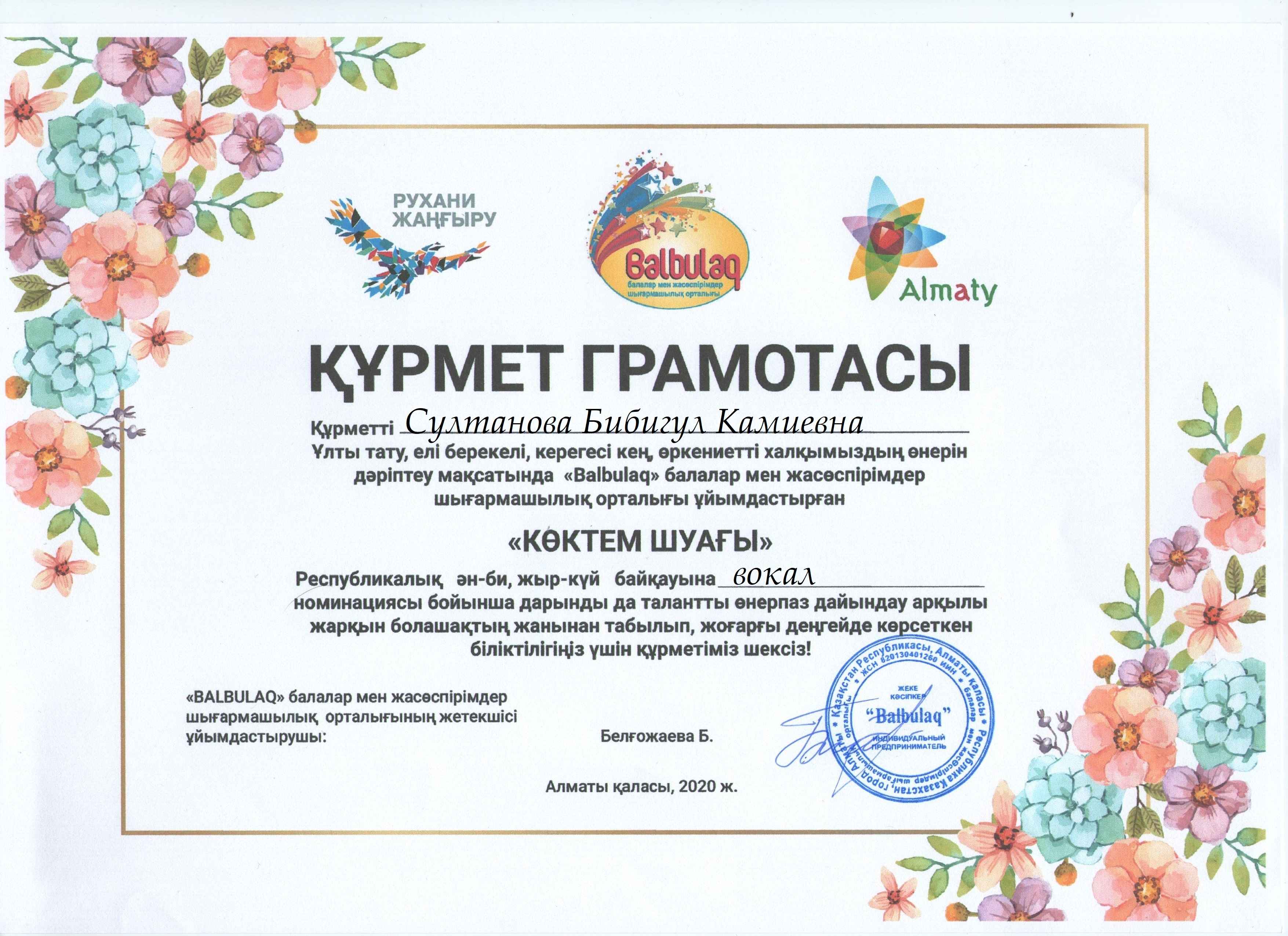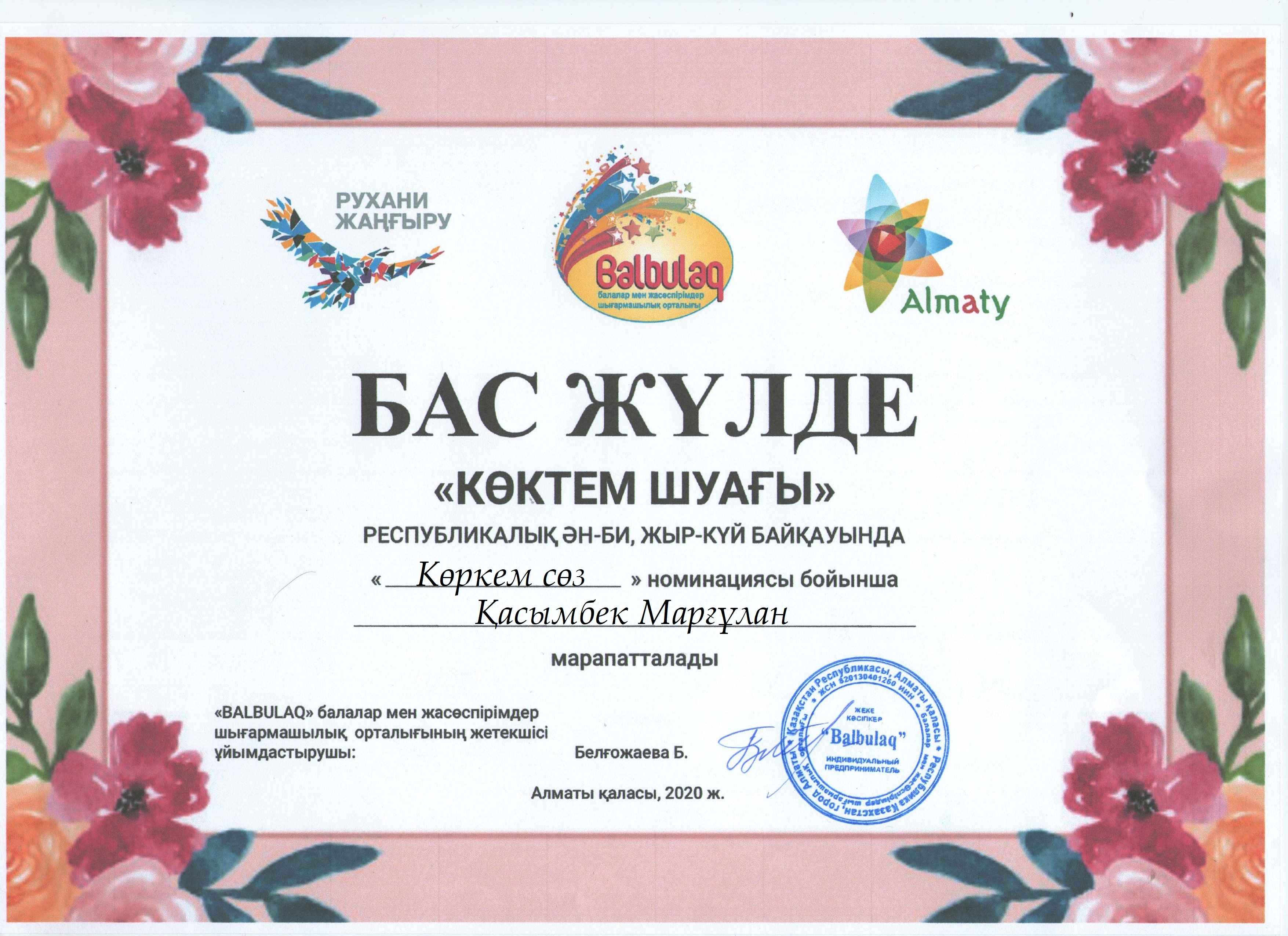«Бал бұлақ» балалар мен жасөспірімдер шығармашылық орталығы ұйымдастырған «Көктем шуағы» республикалық ән-би, жыр -күй байқауына«Жангелдин ауданының білім беру бөлімінің Болат Хамзин атындағы өнер мектебі» КММ -нің оқушылары қатысып жүлделі орындарға ие болды. Осы жаналықты Б.Хамзин атындағы өнер метебі сайтына орналастырсаңыздар.