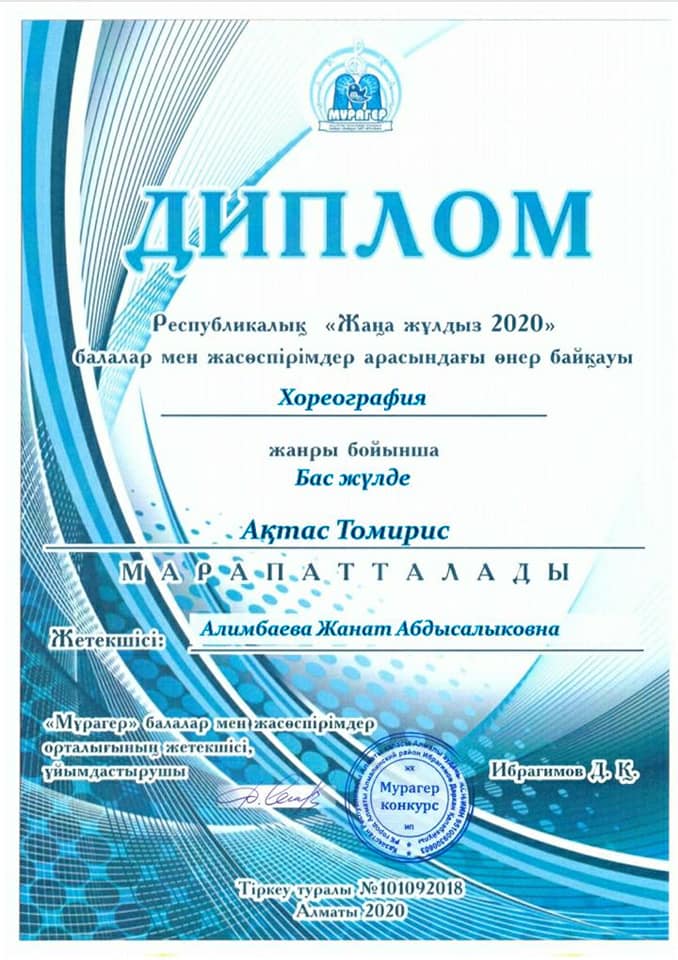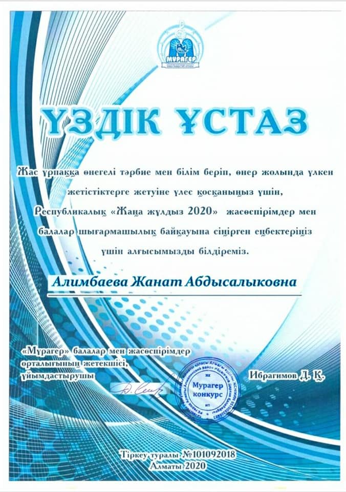 Қазақстан Республикасы білім және ғылым министрлігі Республикалық қосымша білім беру әдістемелік орталығының ұйымдастыруымен 2020 күзгі маусым "XXI ғасыр педагогы" республикалық қашықтық конкурсында би өнері бағыты бойынша І орын алғаны үшін мектебіміздің хореография бөлімінің ұстазы Алимбаева Жанат марапатқа ие болды. Сонымен қатар "Мұрагер" балалар мен жасөспірімдер орталығының ұйымдастыруымен Республикалық "Жаңа жұлдыз 2020" балалар мен жасөспірімдер арасындағы өнер байқауында Жанат апайымыздың шәкірті, жас ұстаз Ақтас Томирис Бас жүлде иеленсе, ұстазы Жанат апайға жас ұрпаққа өнегелі тәрбие мен білім беріп, өнер жолында үлкен жетістіктерге қол жеткізгені үшін, Республикалық "Жаңа жұлдыз 2020" жасөспірімдер мен балалар шығармашылық байқауына сіңірген еңбегі үшін ҮЗДІК ҰСТАЗ марапат қағазымен марапатталды.