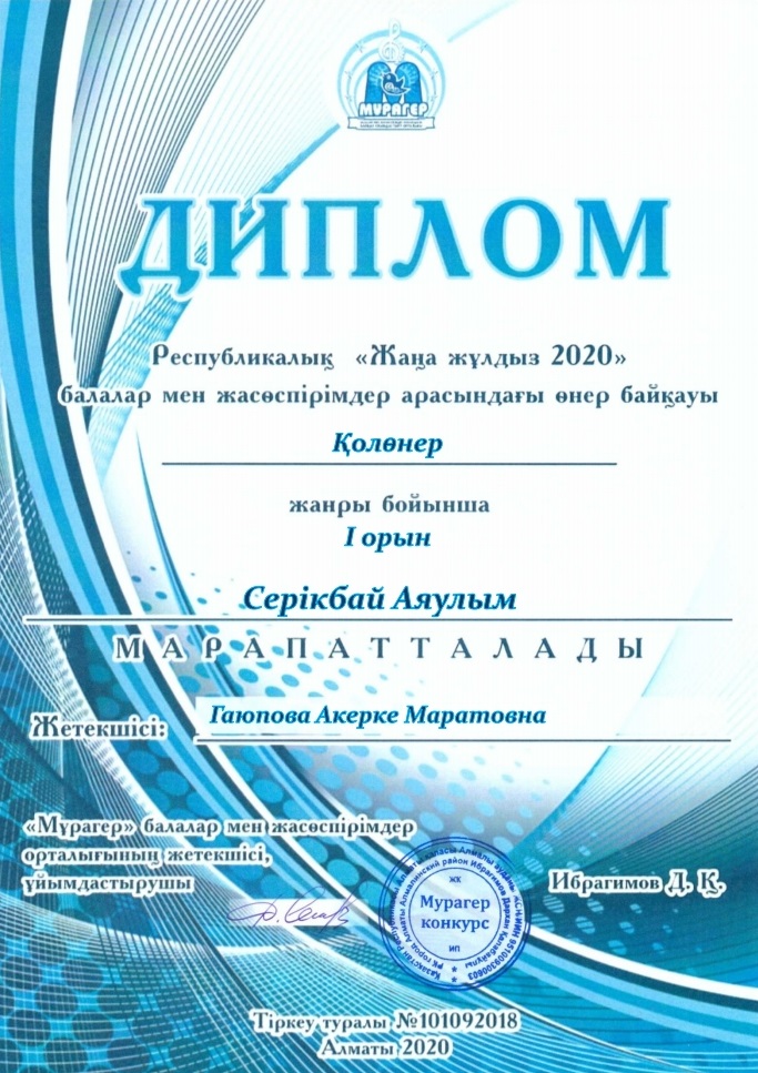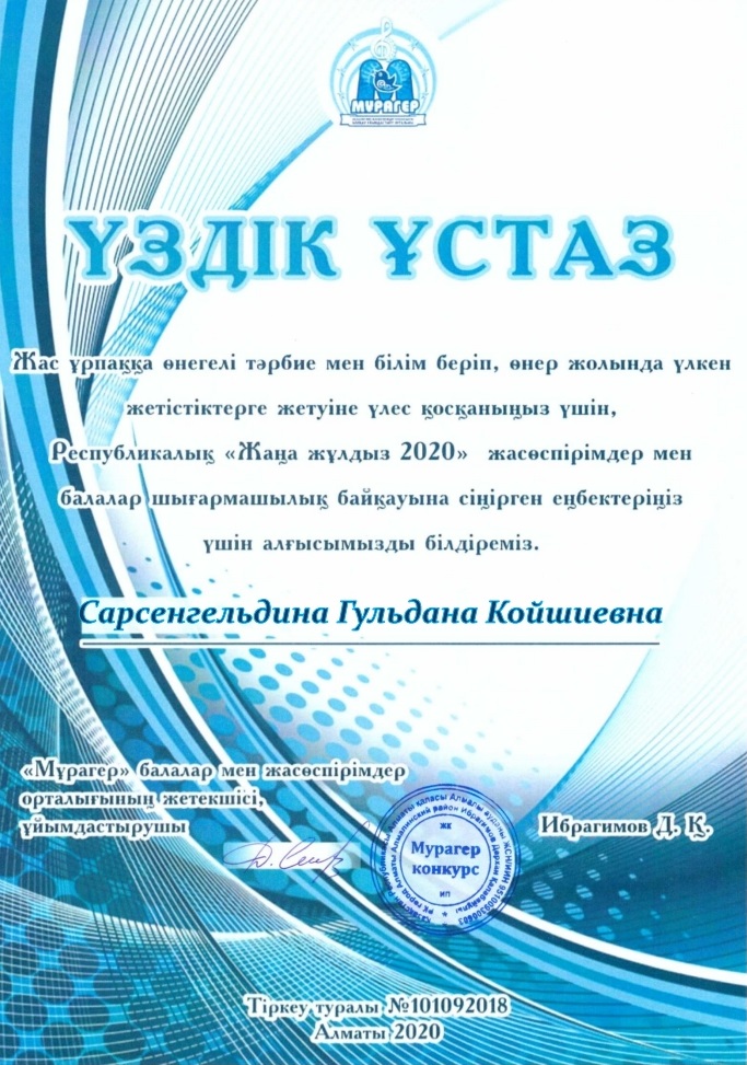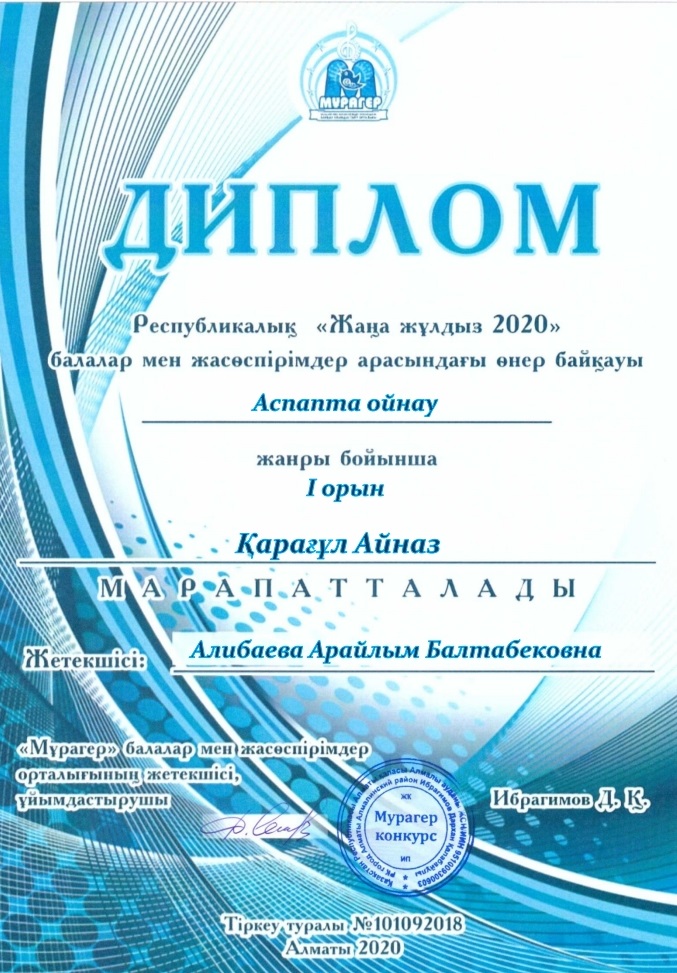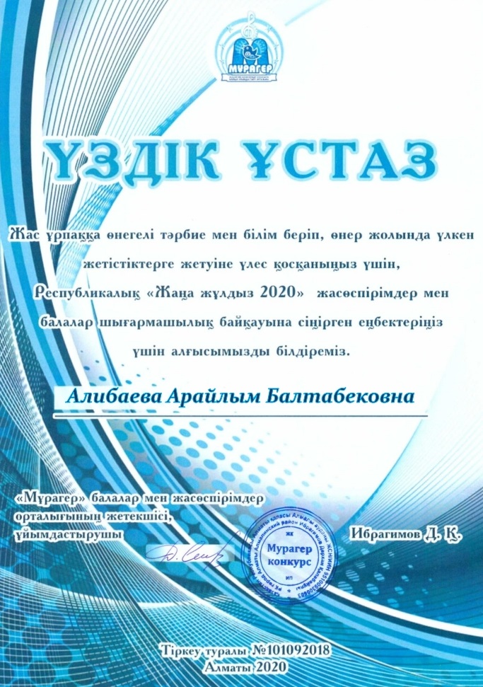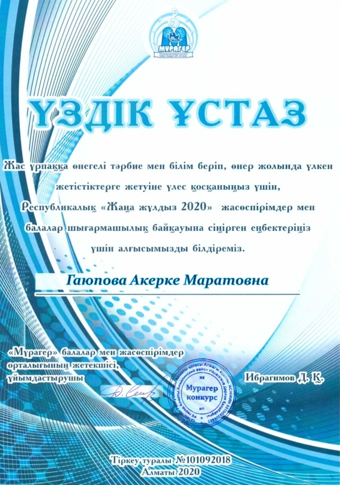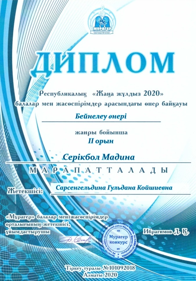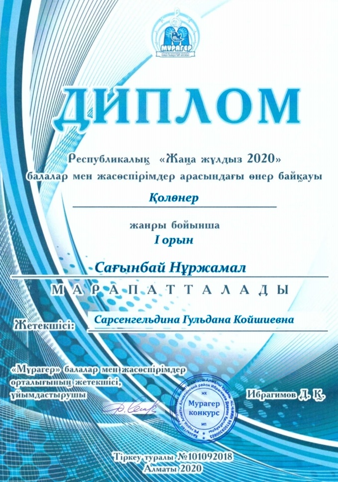 "Мұрагер" балалар мен жасөспірімдер орталығының ұйымдастыруымен қазан айында өткен Республикалық "Жаңа жұлдыз 2020" балалар мен жасөспірімдер арасындағы қашықтық өнер байқауына мектебіміздің домбыра, қобыз, хореография және бейнелеу өнері бөлімдерінен 6 оқушы мен 1 тәжірибеден өтуші мектеп түлегі қатысып, нәтижесінде 2 - Бас жүлде, 4 - 1 орын, 1 - 2 орынды жеңіп алды. Осы оқушыларды дайындаған жетекшілері ұйымдастыру алқасының "Үздік ұстаз" алғыс хатымен марапатталды.
