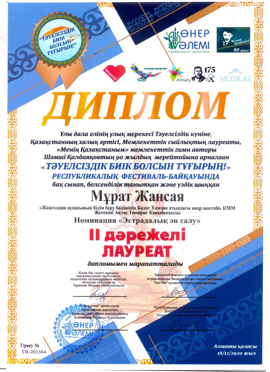 Өнер әлемі продюсерлік орталығының ұйымдастыруымен өткен «Тәуелсіздік биік болсын тұғырың» атты республикалық фестиваль-байқауында мектебіміздің оқушысы Мұрат Жансая «Эстрадалық ән салу номинациясы бойынша екінші орын, хореография номинациясы бойынша «Еркеназ» би ұжымы бас жүлдені жеңіп алды.