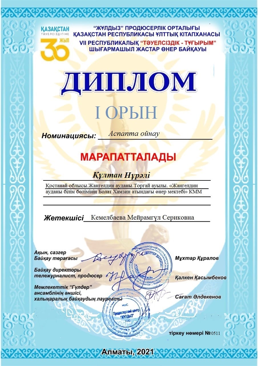 «Жұлдыз» продюсерлік орталығы Қазақстан Республикасы ұлттық кітапханасының ұйымдастыруымен өткен VIII Республикалық «Тәуелсіздік-тұғырым» шығармашыл өнер байқауына мектебіміздің домбыра, вокал, бейнелеу өнері бөлімдерінің оқушылары қатысып, нәтижесінде домбыра бөлімінің оқушысы Құлтан Нұрәлі І орын /домбыра бөлімі/, Мұрат Жансая І орын /вокал бөлімі/, Балғалы Мерей І орын /вокал бөлімі/ және Қосылбек Айша І орын /бейнелеу өнері бөлімі/ иегері атанды.