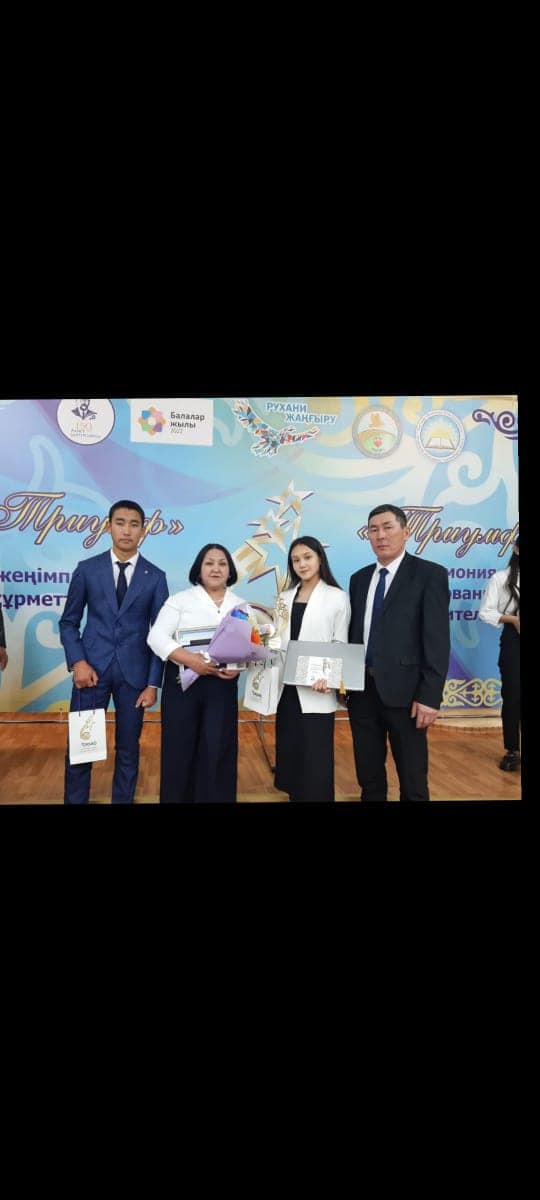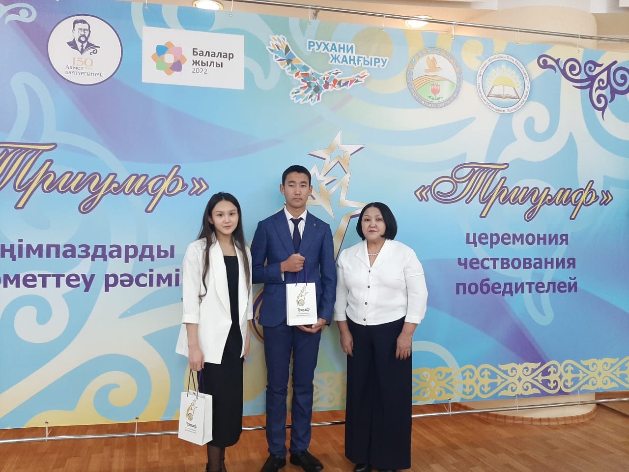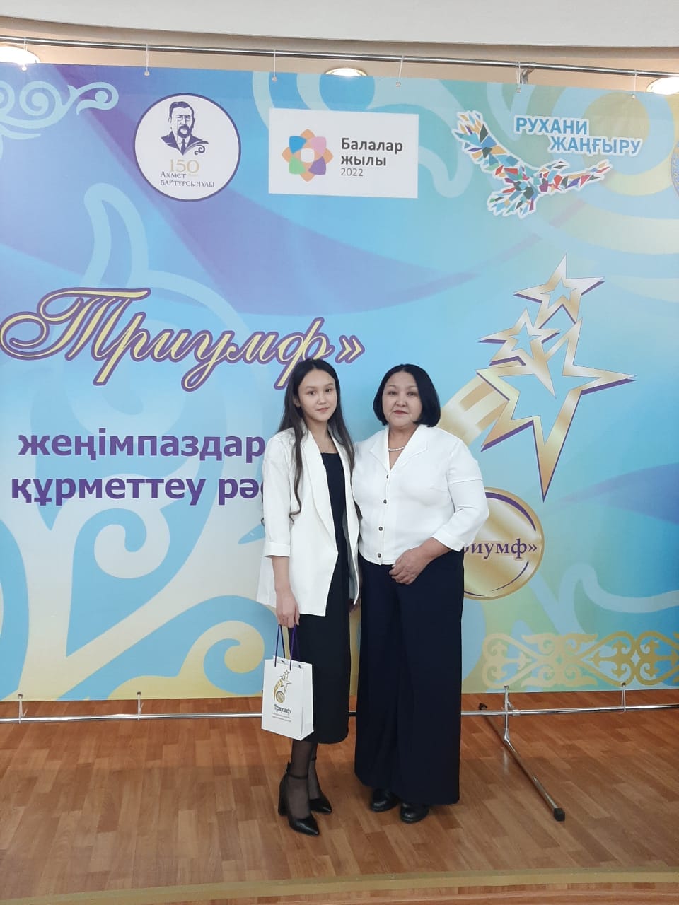 Осы марапаттау рәсіміне мектебіміздің "Еркеназ" хореографиялық ұжымының мүшесі Сәбитбек Ақбота және жетекшісі Алимбаева Жанат Абдысалыковна барып қатысып, Қостанай облысы әкімдігінің білім басқармасының басшысы Зәуре Әнуарбекқызының қолынан "Триумф" естелік мүсіншесін, ноутбук пен құттықтау хатын алды. Ал осы оқушыны дайындаған педагогі Жанат Абдысалыковнаға Қостанай облысы әкімінің алғыс хаты және планшет берілді.